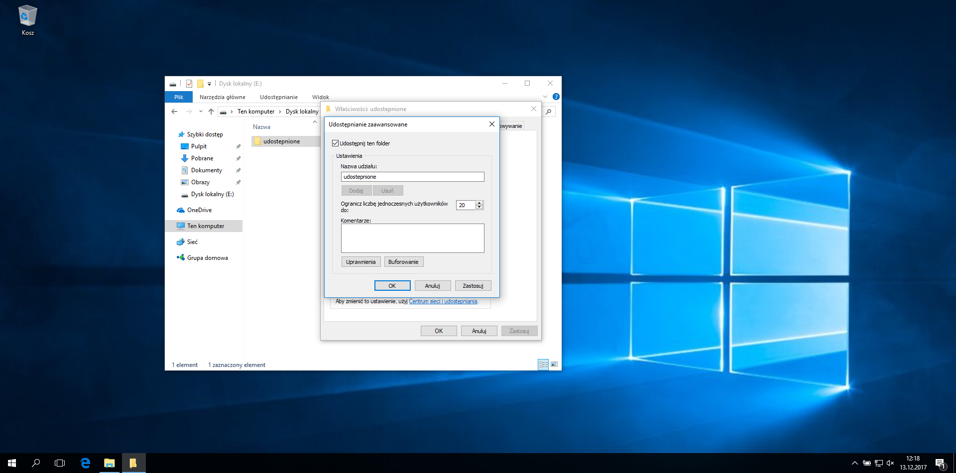 - W polu „Nazwa udziału” wpisz nazwę, pod jaką folder będzie widoczny w sieci (np. „udostępnione”).