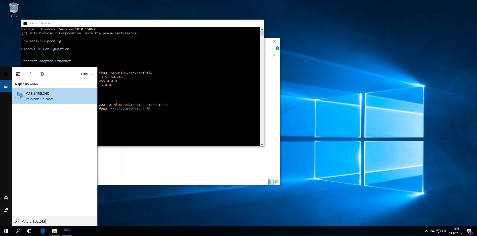 ipconfig - Znajdź adres IPv4 komputera w sekcji „Ethernet adapter” lub „Wireless LAN adapter” (np. 13.5.150.243).